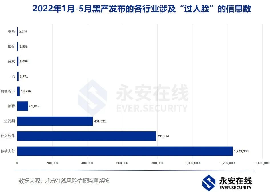 以“过人脸”等关键词在网上检索,仅5个月内,高达6199名黑产在各个渠道发布了累计144万余条信息,涉及8个行业,其中移动支付行业、社交行业、短视频行业沦落为灾区。